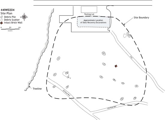 Within the excavation area at site 44IW0204, there are four debris piles and two depressions with a nearly east to west alignment. The debris piles and depressions were subsequently divided into three features, Features 601-603. Features 601 and 603 each consist of one debris mound. Feature 602 consists of two debris mounds and two depressions. The boundaries of each feature were determined through probing and defined by brick and stone debris. They were then drawn in plan view and photographed.
